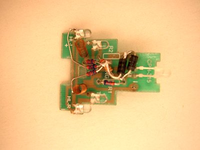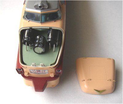 上の写真がヘッドライト関連の加工です。ヘッドライトは白色LEDとし、導光材の元の部分を少しカットして オレンジ色のプラ(シャープペンシルの柄の部分を使用)を接着し、シールドビームに近い色にしています。 また、ヘッドライトとヘッドマークの抵抗は定電流ダイオードに変更、また保護用のダイオードと、 ボンネット内にちらつき防止用のコンデンサーを追加しています。低速がいまひとつだったので、 モーターをコアレス(LN−14)に変更し、走り出しの電圧を上げるためのダイオードを直列に5ヶ(1両10ヶ)追加・ その他、白色LEDの室内灯・手すりを0.3mmの真鍮線へ変更・床下、パンタグラフ、運転室、シート、カーテンの塗装・ シートカバー張り付け・床下を含むインレタの転写・ウェザリングなどで、加工時間は計100時間ほどかかりました。