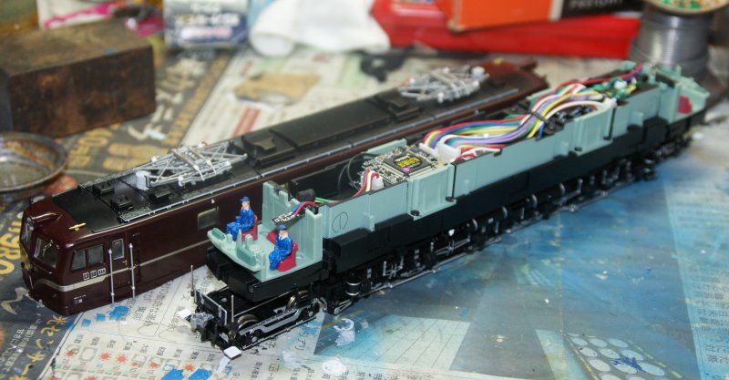 裏にある4箇所のネジを外すと簡単に上下分解できます。 1エンドに運転手を追加。カプラーを1エンドに開放用のレバーを切断した KD153、2エンドをKD158に変更、銀に塗装しています。