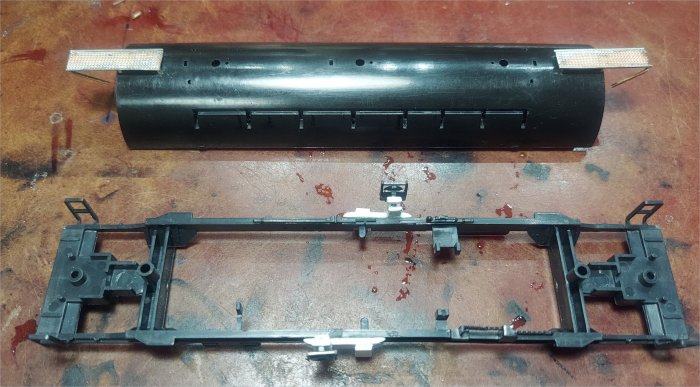 上の写真が作成の状態です。渡り板は真鍮、下の送気管?はプラで作成しました。 手すりの本数やはしごの位置の違いには目をつぶります。